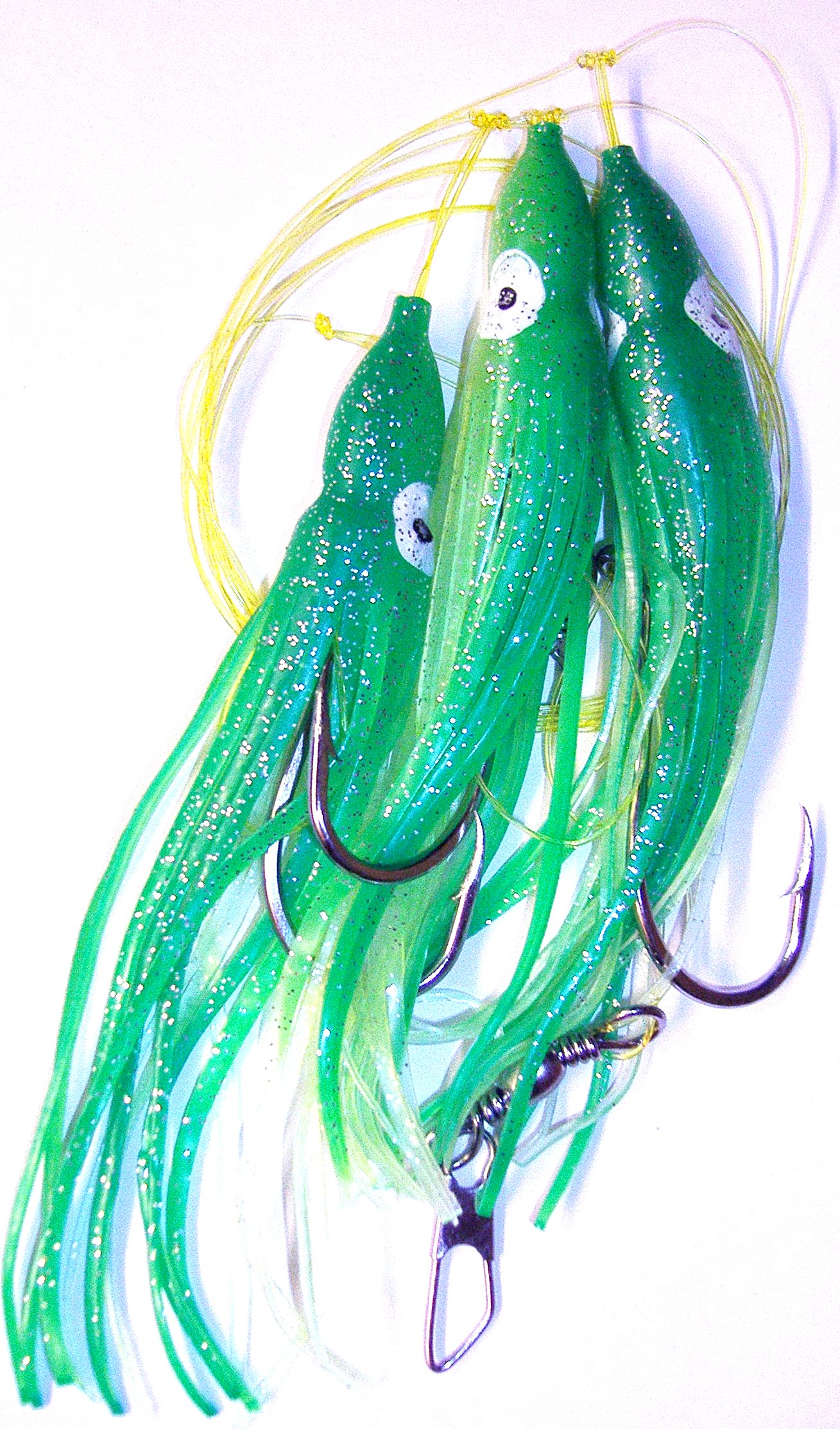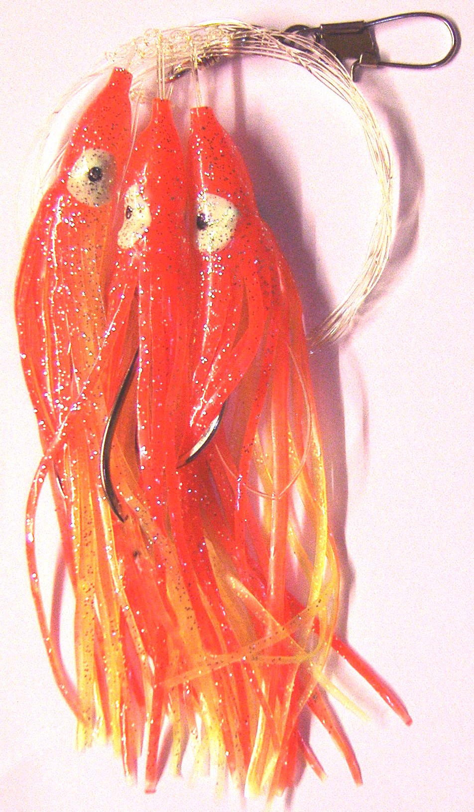 Octopus-Vorfach zum Meeresfischen. 3 Seitenarme mit kräftigen, vernickelten Einzelhaken. 4 Spezial selektierte Farbvarianten mit Glitter und Leuchtaugen - für optimalen Erfolg in Norwegen, Nord- und Ostsee.