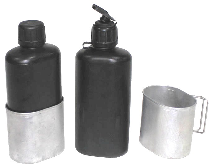 Diese Originale Feldflasche M 84 der Schweizer Armee besteht aus einer schwarzen Kunststoff-Trinkflasche mit Stülpbecher aus Aluminium und Klapphenkel.