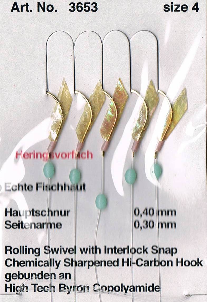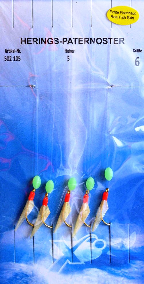 Heringsangeln an der deutschen Küste erfreut sich immer größerer Beliebtheit. Mit diesem Heringspaternoster, mit 5 Goldhaken und ECHTER Fischhaut bestückt, ist man immer gut ausgestattet. Bei ungünstigen Wetterverhältnissen haben die Leuchtperlen einen zusätzlichen Lockeffekt. Auch die rote Lockwicklung am Hakenschenkel steigert die Fängigkeit. Die starke monofile Haupt- und Mundschnüre geben die Sicherheit um die gefangenen Heringe sicher zu landen.